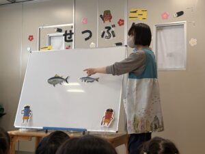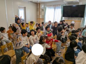集会後部屋で豆まきをしていると、鬼が登場👹