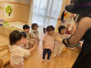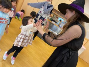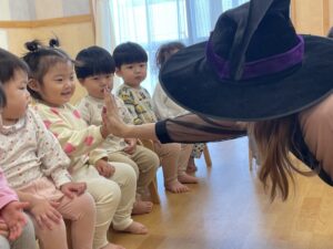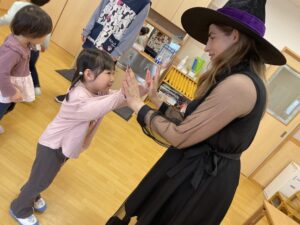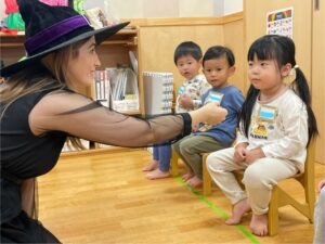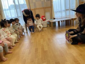 絵本を読んでもらったり、ハロウィンの単語を一緒に言ってみたりしました😊
