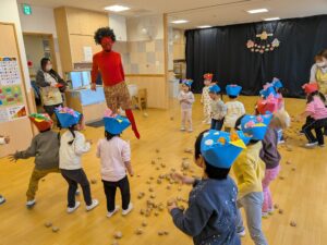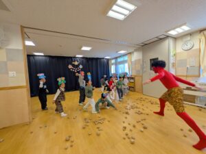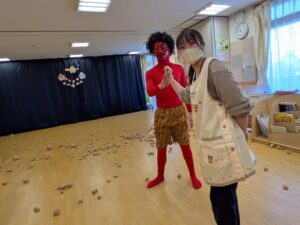 鬼が怖くて泣いてしまうお友だちもいましたが、大きな声で「おには~そと!ふくは~うち!」と言って、幼児クラスは新聞紙豆や乳児クラスはカラーボール投げることができました。