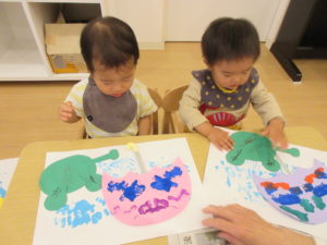 開いてみるともう半分にも絵の具の色が移っている様子に目を丸くさせたり、保育者と一緒に「わぁ~」や「きれいだねー」と嬉しそうに言う様子が見られました!
