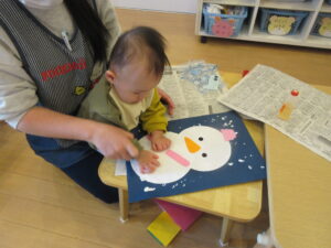 指スタンプで雪を表現しトントンと言いながら雪を降らせましたが、吹雪いている子もいたりと上手に出来ました。雪だるまを好きな所に貼り、目や鼻を貼るときは自分の目や鼻を触りながら貼り、マフラーに手袋、帽子もだいたいの場所を伝えると上手に貼ることが出来、それぞれとっても可愛い雪だるまが出来ました✨