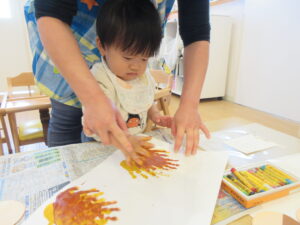 手形を押すときは色の違う絵の具を使って行うたび、楽しくなっていました😊たくさん押すことができました!