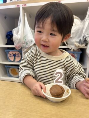 お誕生日ケーキの2歳の旗の特別感をじっくりと味わっていたお友だちです😊