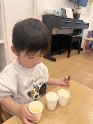 カップにそれぞれのだしを入れ、飲んでもらいました。塩は入れず、素材のそのままの味です。