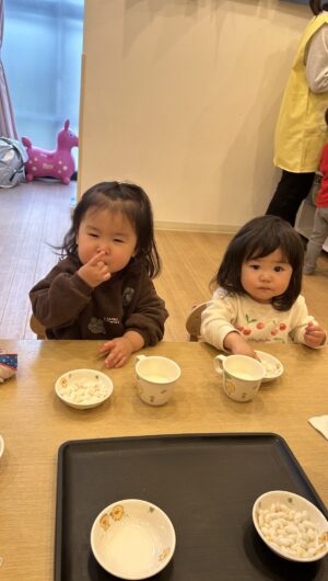 カラフルなひなあられに嬉しそうな子供たち。色も楽しみながら一粒一粒味わって食べていました😋