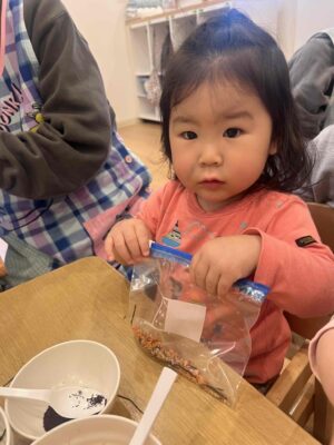 色々な具材をならべ、自分たちで好きなものをジップロックの袋にいれてもらいました✨