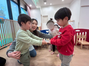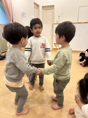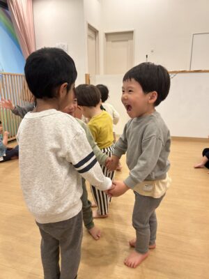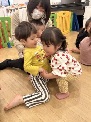 ほし組、つき組さんはにじ組さんとペアになり【ひっつきもっつき】というふれあい遊びを行いました!