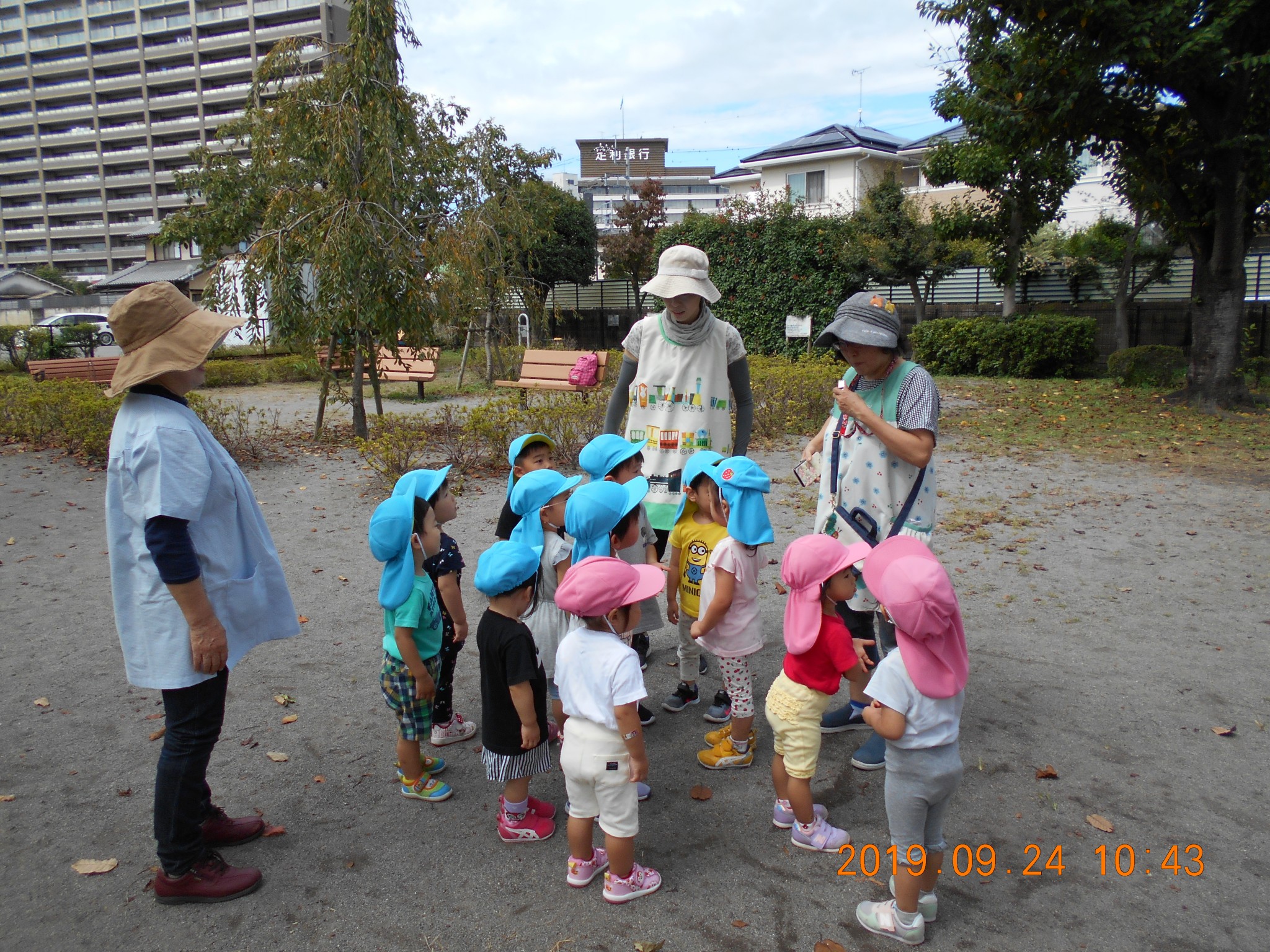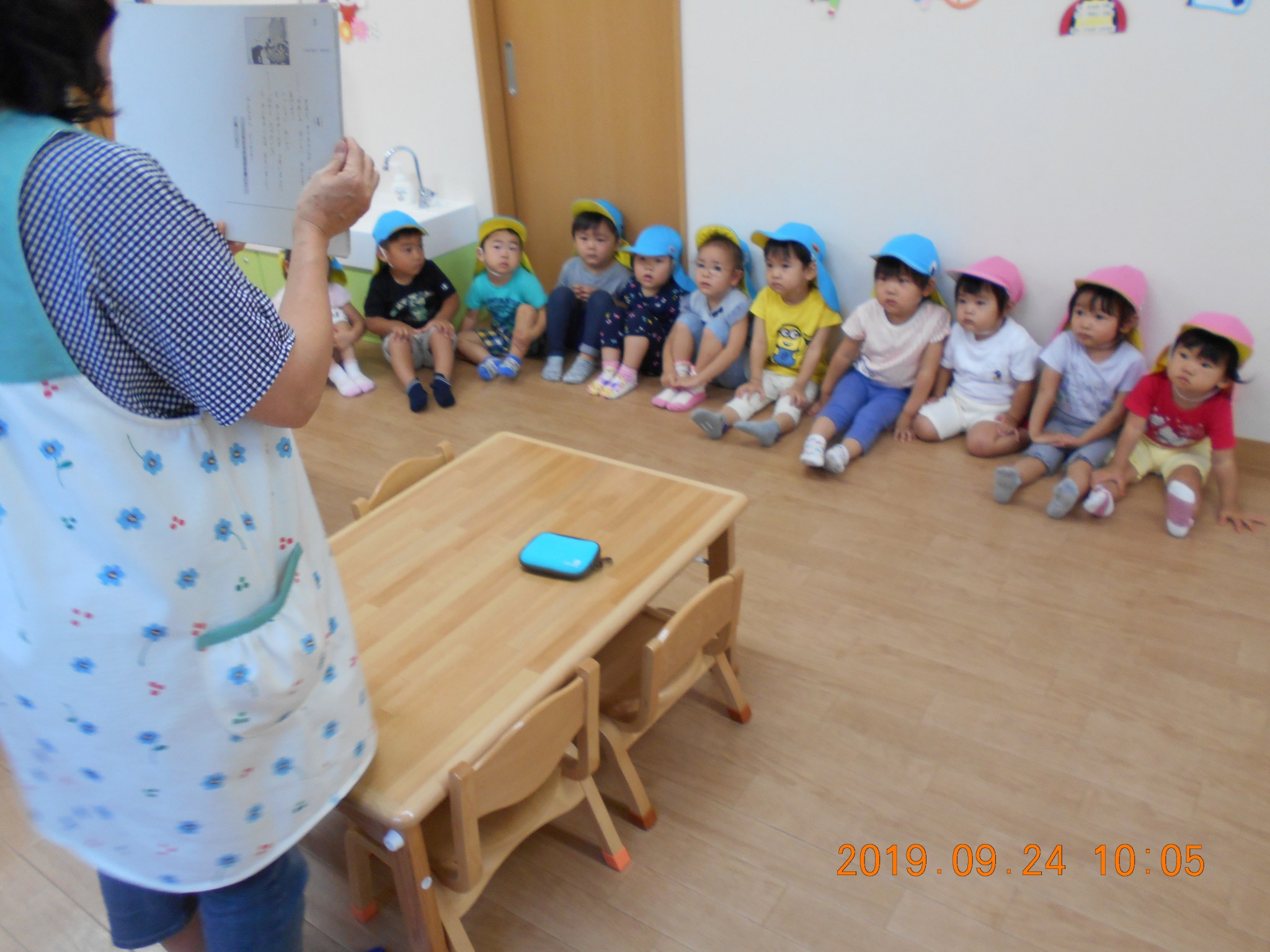 紙芝居[しらないひとにきをつけて]を真剣に聞いていた子ども達。「おかしあげるから」といわれても「くるまにのらない?」と言われても「だめ、行かない、乗らない」としっかり答えてくれた2歳児のお友だちもいました。公園での訓練では、笛の合図ですぐに集まれたお友だちもいましたが、遊びに夢中だったお友達もいました。笛が鳴ったらすぐ集まれるように日ごろから練習して、いざというときに備えたいと思います。