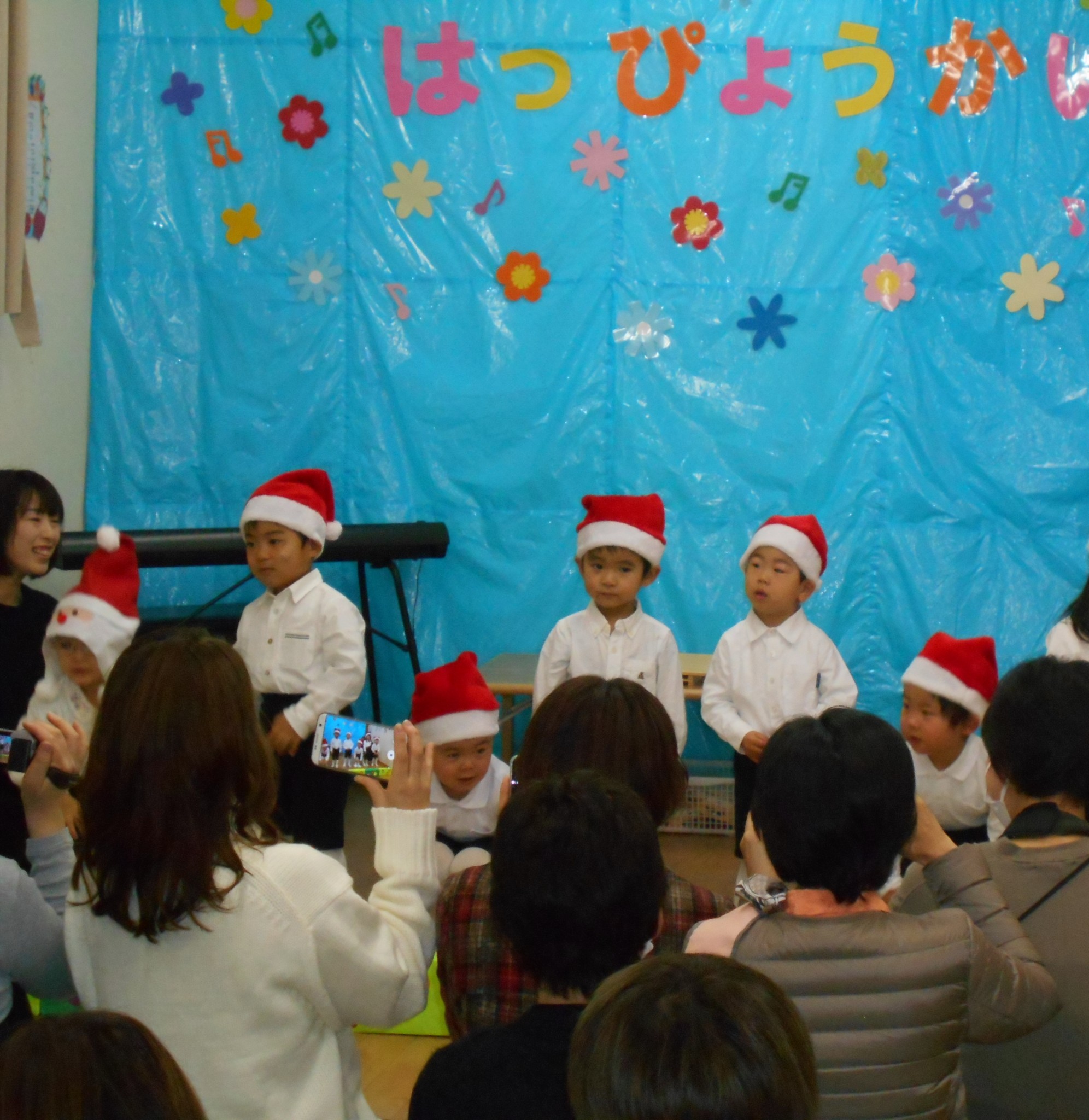 8人のかわいいサンタクロースが歌に合わせて楽器を鳴らしたり、大好きな英語教室で行っているHead shoulders~の歌も上手にできました!