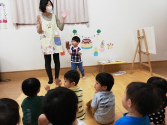 保育士からのプレゼントは、マジックシアター『へんしんおばけ』と、パネルシアター『たんじょうびおめでとう』でした!いろいろな果物に変身していくおばけをとても楽しそうに見ていた子どもたちでした。パネルシアターでは、最後に5月生まれの誕生日のお友だちも登場して、みんなびっくりしながらも、大興奮で見ていました!