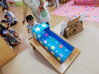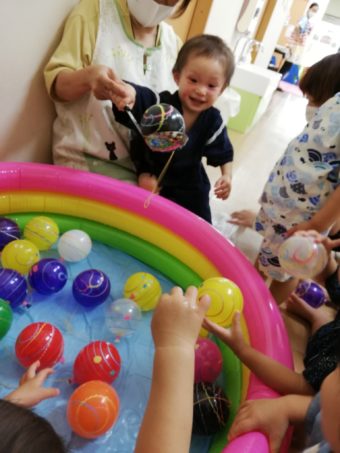 ヨーヨー釣りはお玉で行いました。とても嬉しそうにすくっていましたよ(^^♪