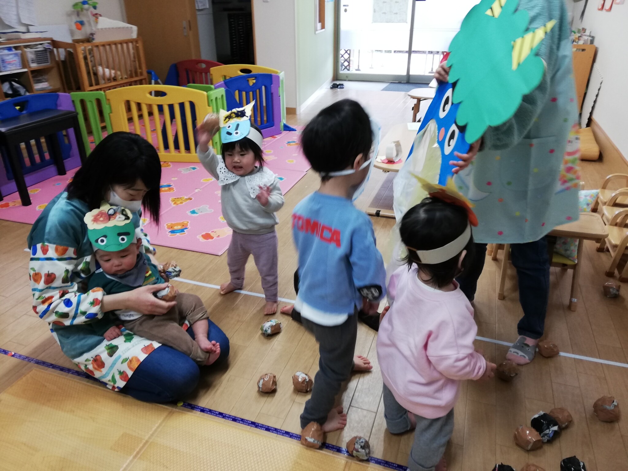 自分たちで作った可愛い鬼のお面を被って節分の行事に参加しました。