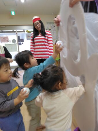 英語を覚えた後は、カードを使ってゲームをしたり、おばけに向かってボールを投げたり色々なゲームを楽しみました👻