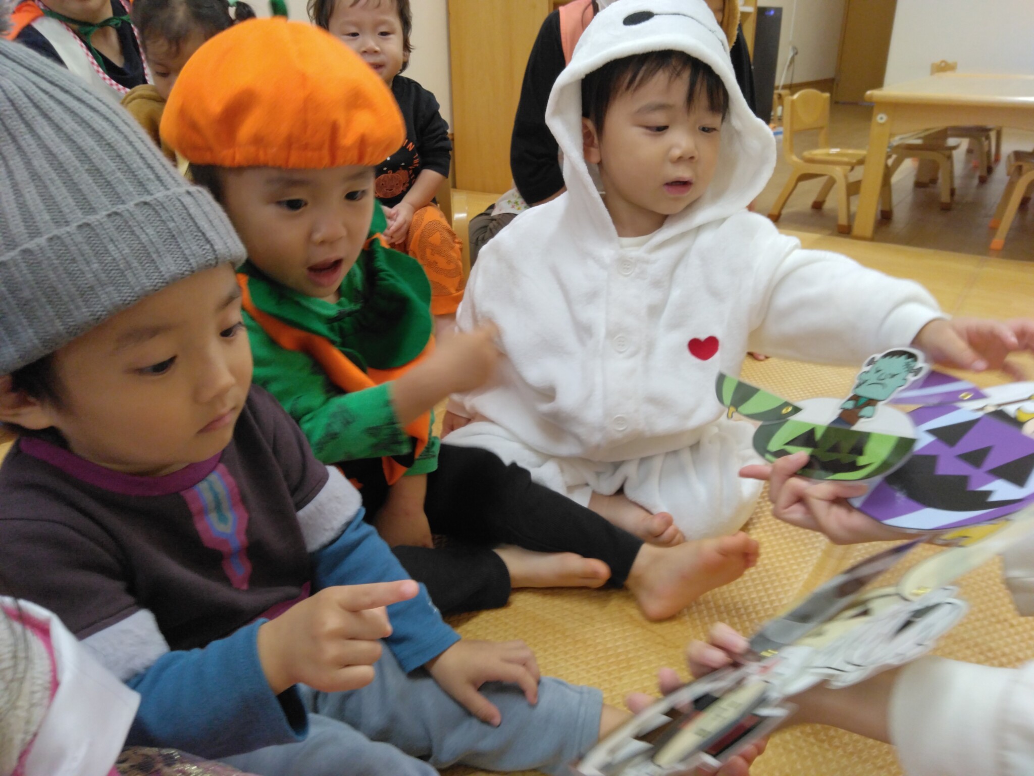 最初に、スケッチブックシアターでハロウィンについての話を聞いたり、『まあるいたまご』ハロウィンバージョンのペープサートを楽しみました。