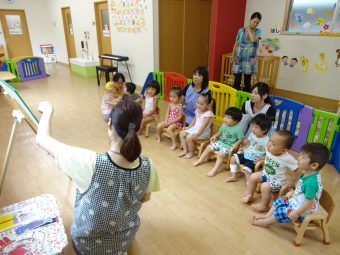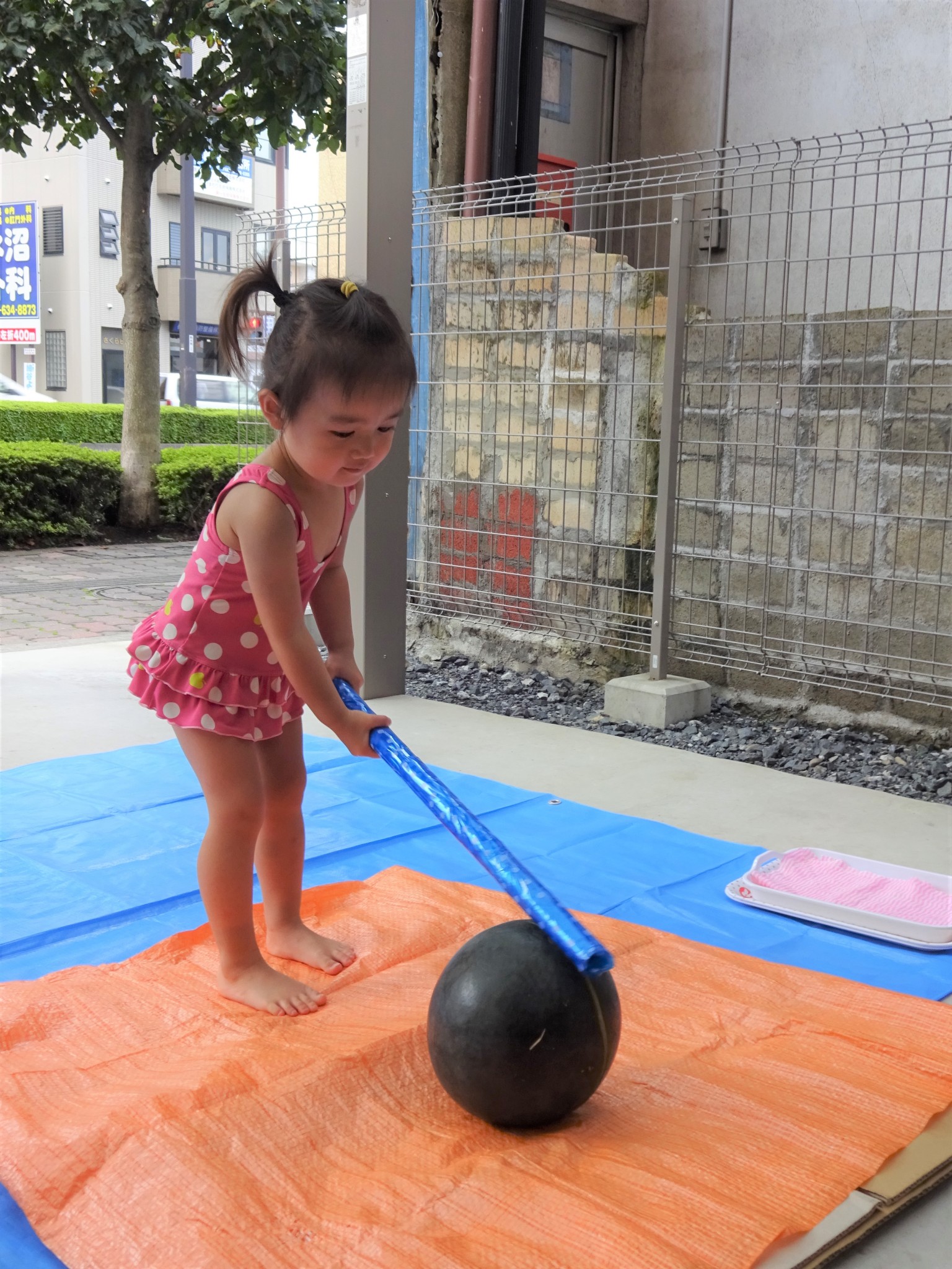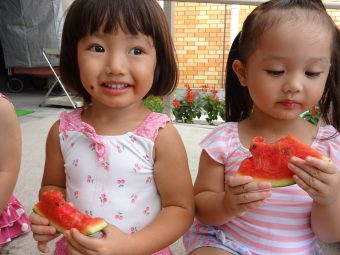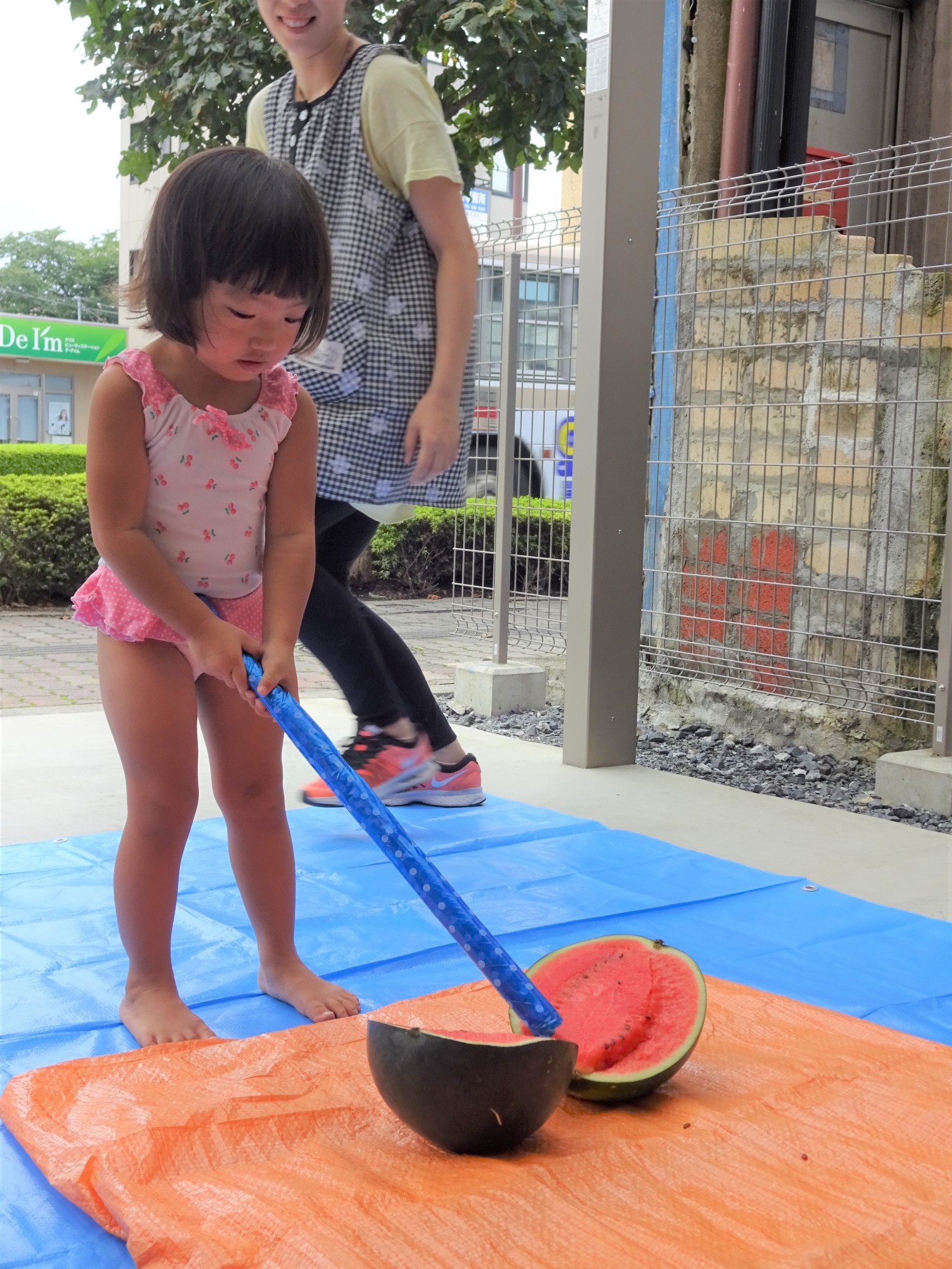 その後は園の前に移動して、ひとりずつスイカ割りに挑戦!!バシッと力強くたたくお友だちや、ちょっと遠慮しながらたたくお友だちがいて、最後はスイカがパカッと綺麗に割れました!