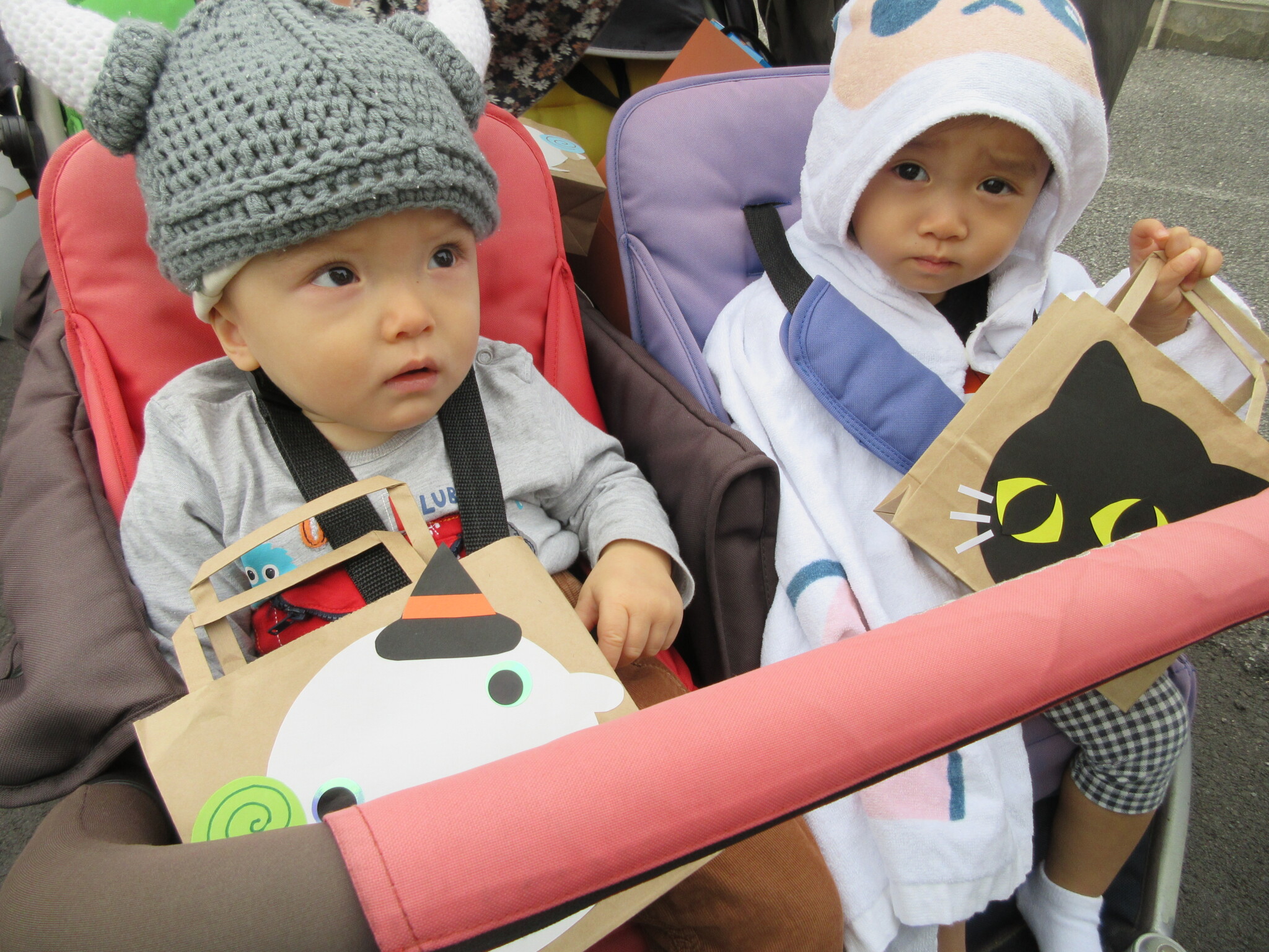 お友だちを待っていたエルガー君に「トリックオアトリート!」と声をかけ、お菓子を貰うと嬉しそうにバックを持ち見ていました♡