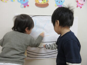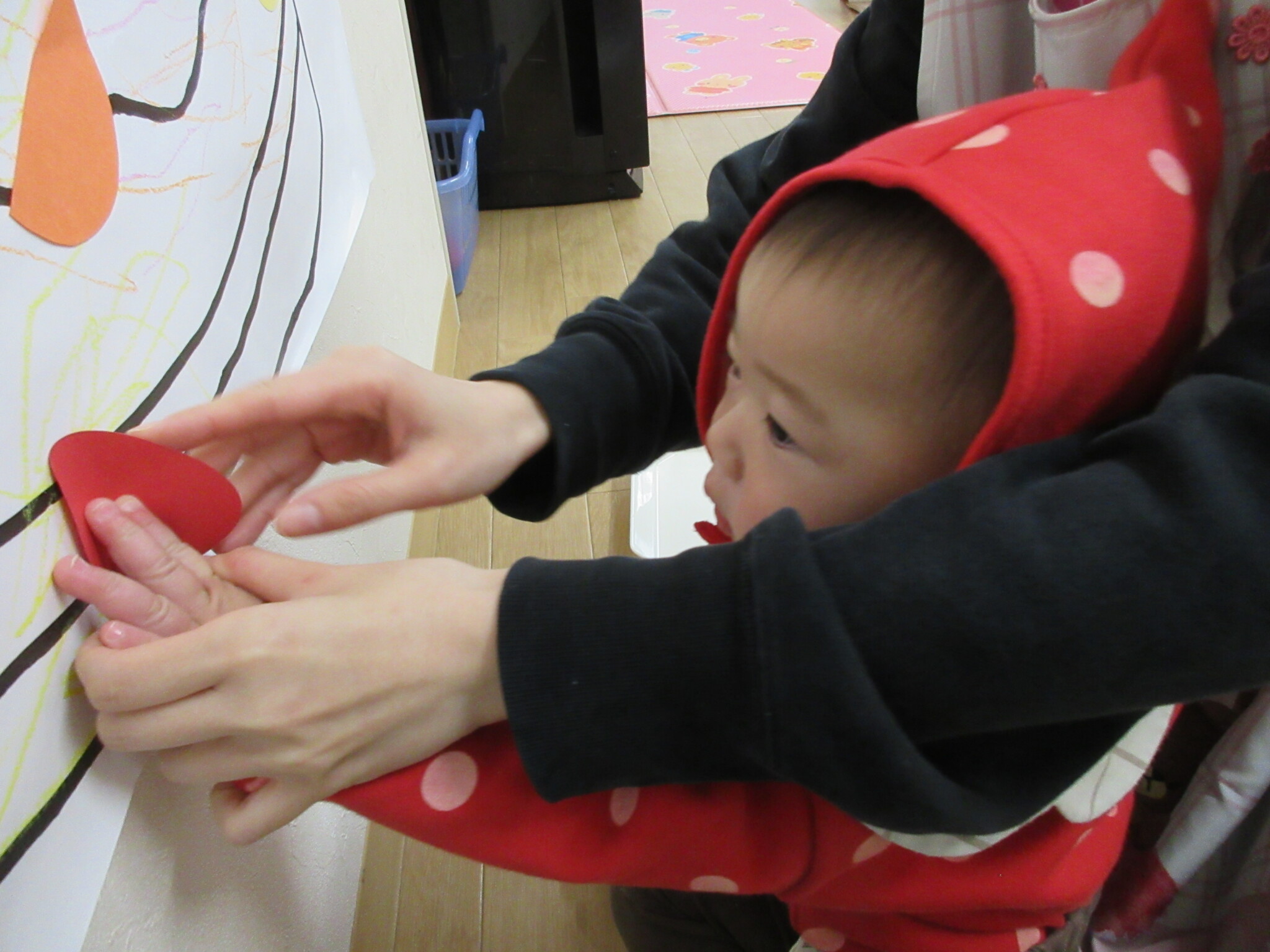 まず初めにクリスマスについての絵本を見ました。「サンタさん!」と言ったり、指をさしたりして楽しく見ていました。