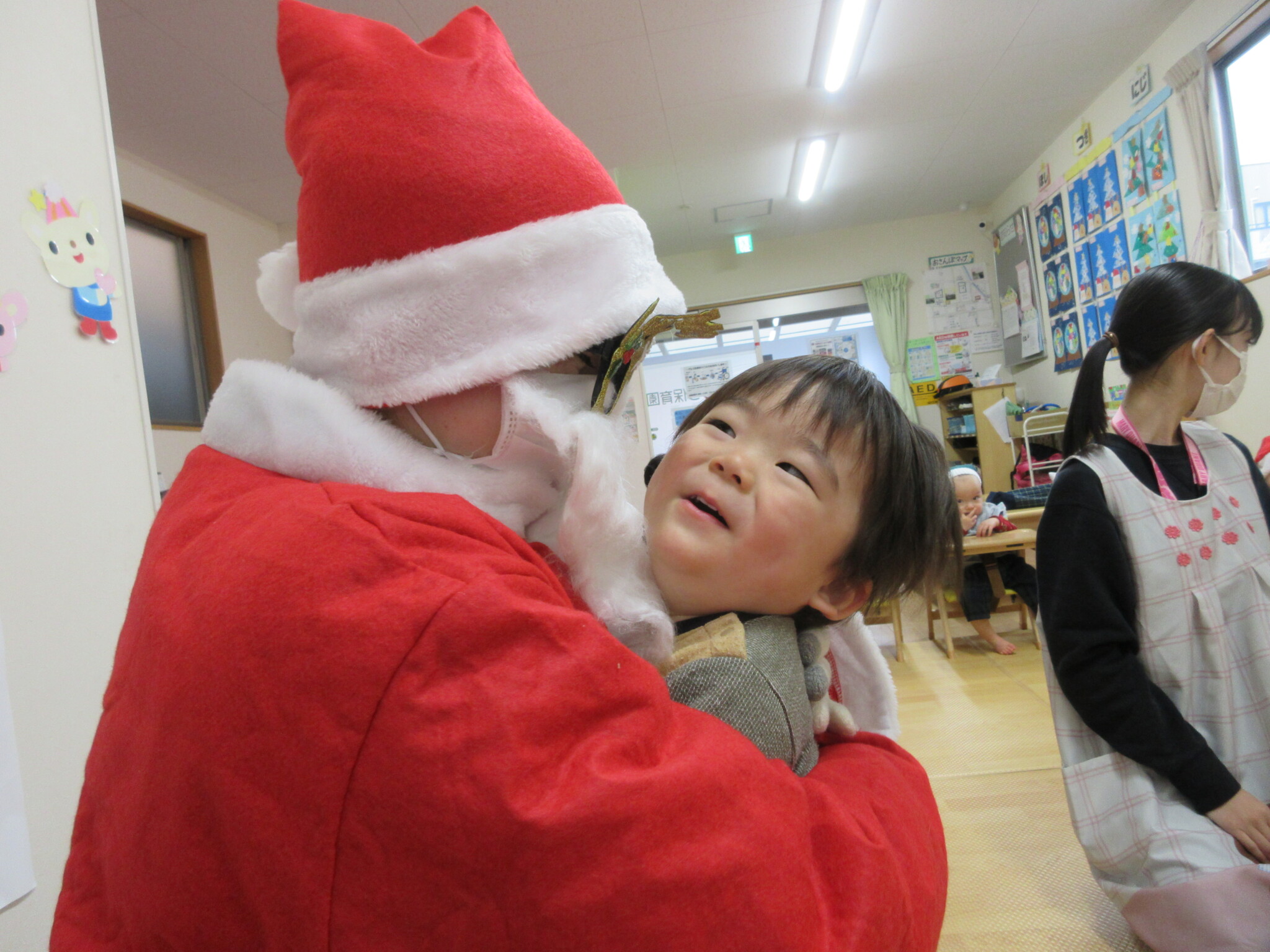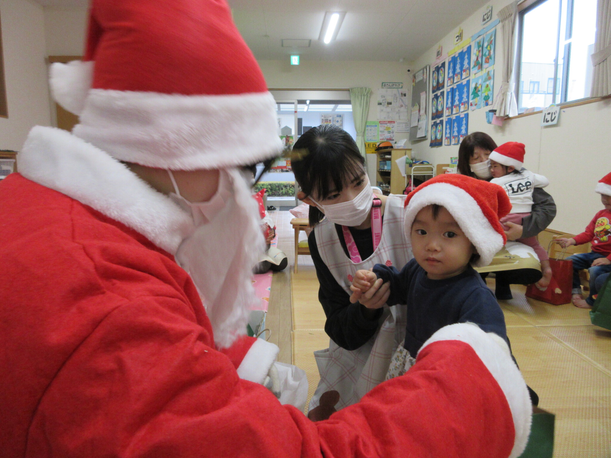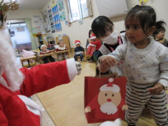 最後に、サンタさんからプレゼントを一人ひとり貰いました。緊張しながらも「ありがとう!」と言ったり、はぐをしてもらい嬉しそうでした☺