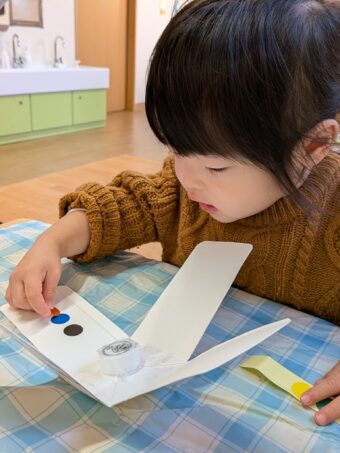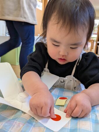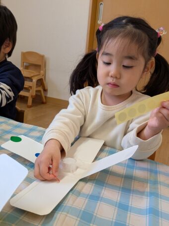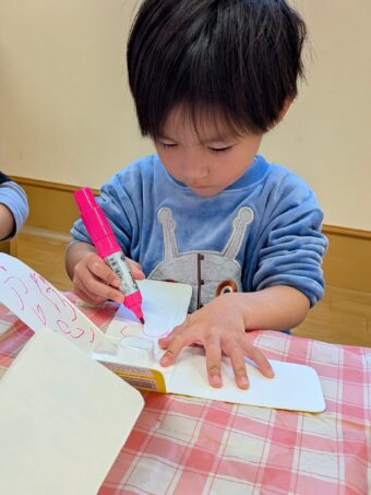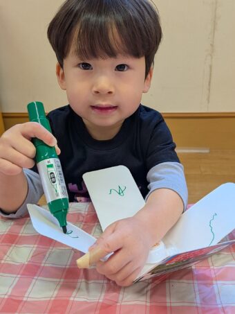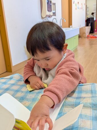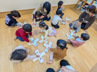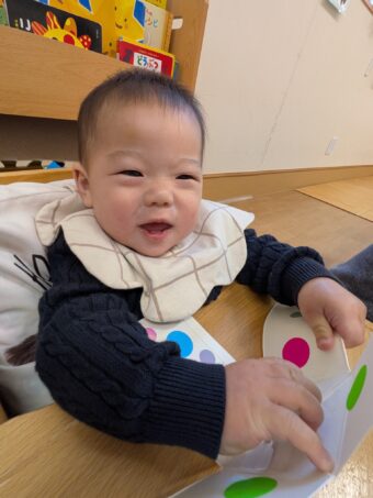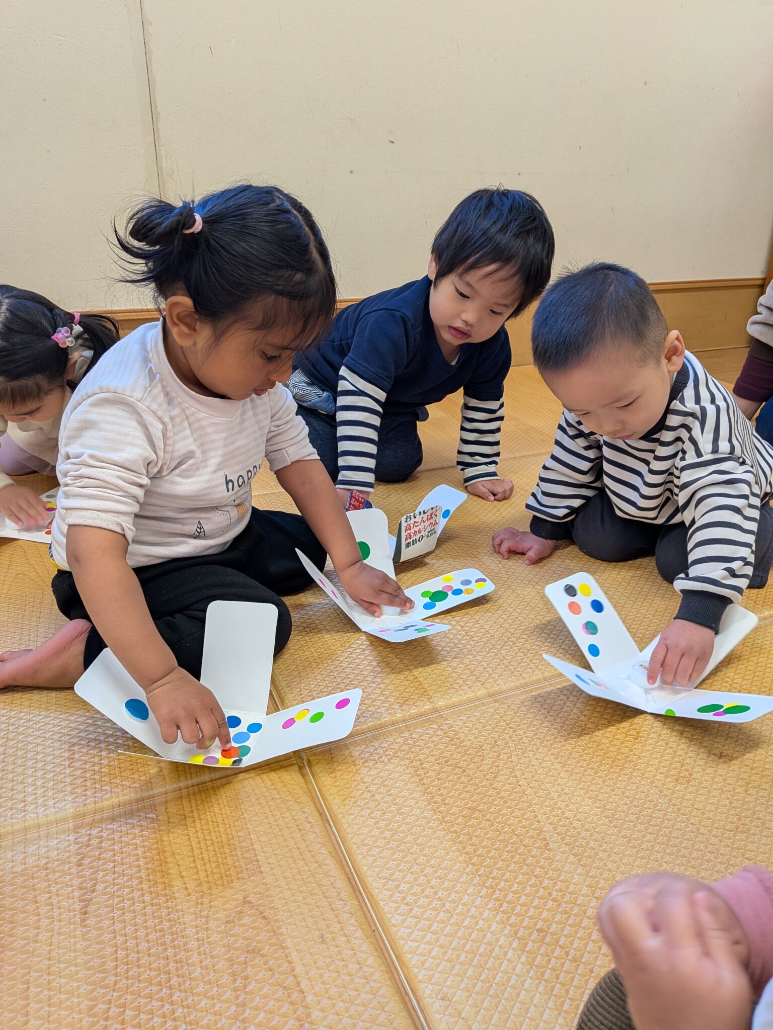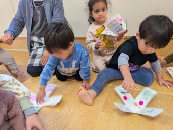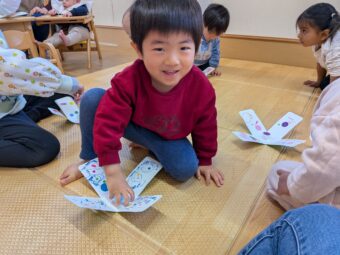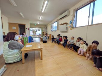 お正月のお話をしました。お正月に飾る門松や鏡餅やおせち料理について話をすると子ども達も、『お家にあるよ。』『みたよ。』『おもち食べた。』と嬉しそうに答えてくれました。
