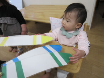 色々な色のバスが登場し、バスの中には動物や食べ物などが乗っていて、「トマト!」「バナナ!」「カエル!」など大きな声で答えて楽しんでいました。