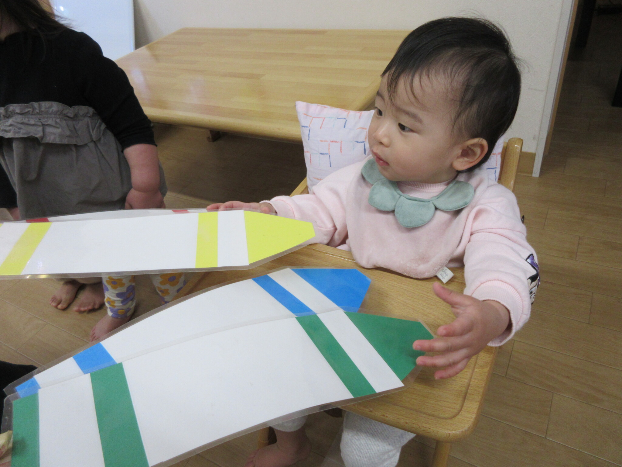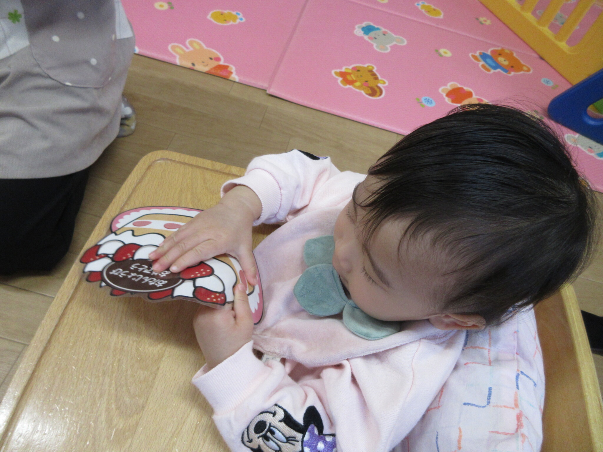 3人に好きな色を聞くと、にじ組のAさんとつき組のRさんは「あか」と声に出して答えてくれました。ほし組のMさんは緑と黄色のカードを握りしめていました。次に好きな動物を聞くと、それぞれ好きな動物を指差しで教えてくれました!