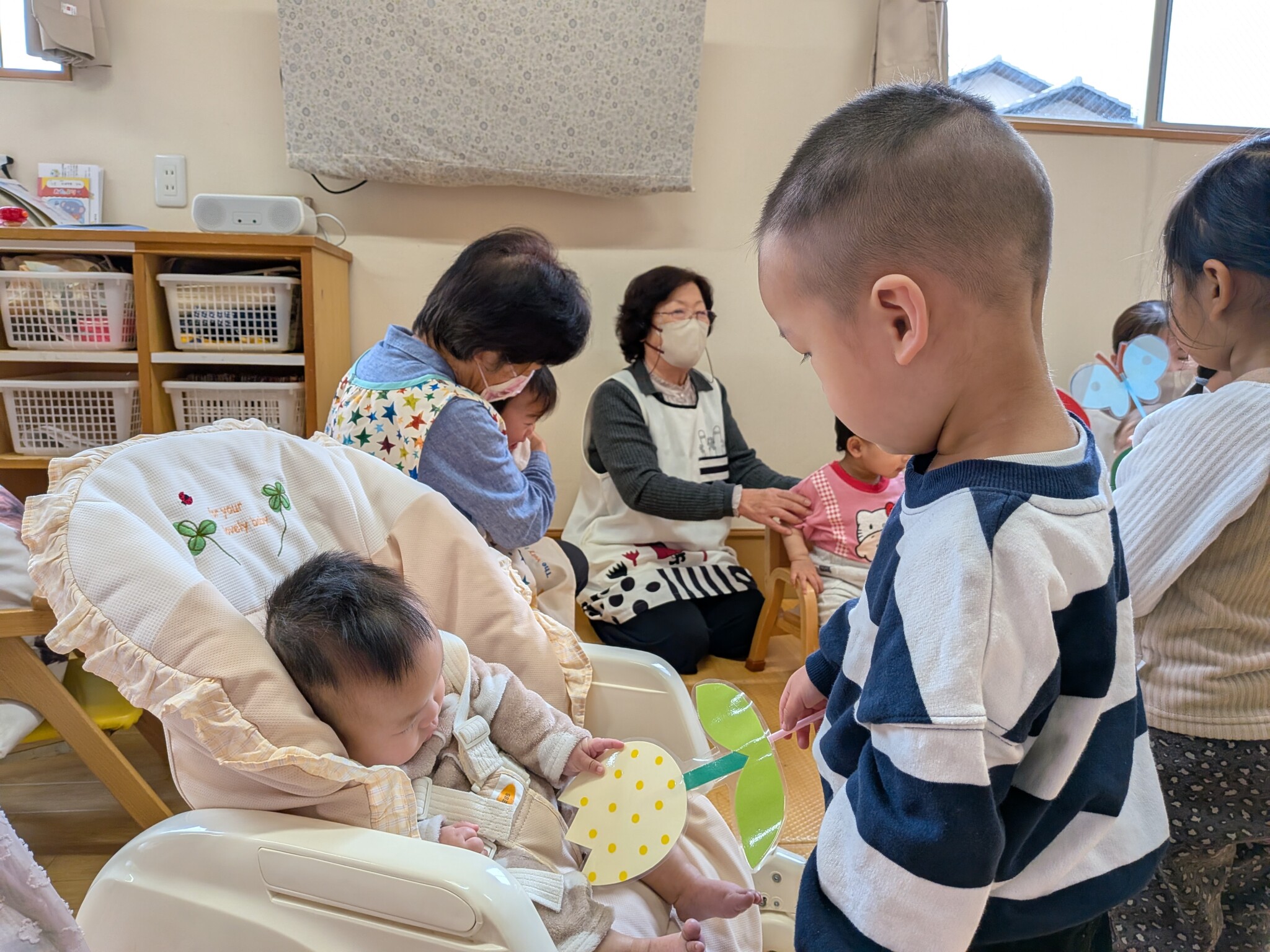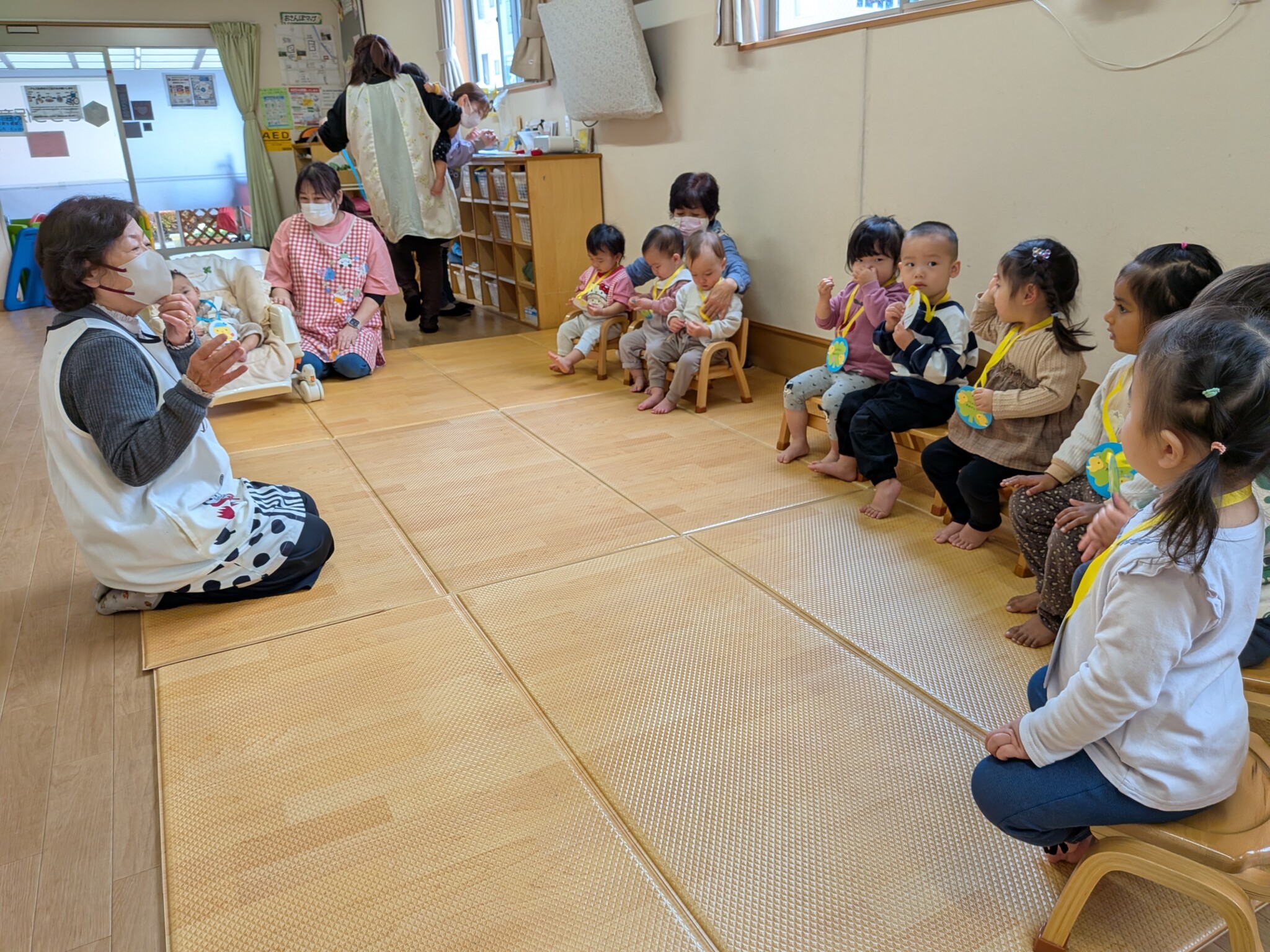 大型絵本を見た後、『チューリップ』の歌を歌いました。にじ組さんが、ペープサートを動かしながら、ほし組やつき組のお友だちの前に立って一緒に歌ってくれました。