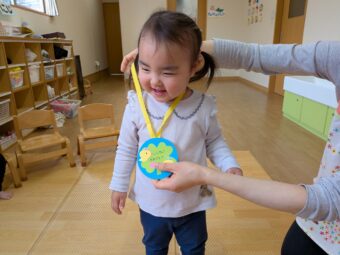 お名前を呼ばれると少し照れたり嬉しそうにしながらお返事をして、担任の先生からメダルをもらいました。