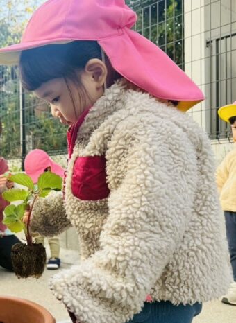 秋晴れの青い空の下で、つき組🌙さんのみんなでいちご🍓の苗を植えました……