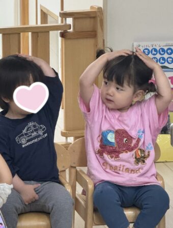 地震の避難訓練をしました。ぐらぐら…と揺れたら、頭を守るよ★★さっそくやってみます〜!