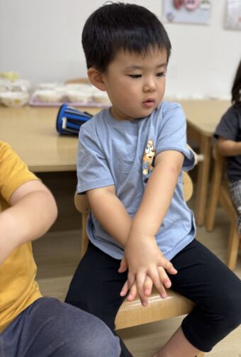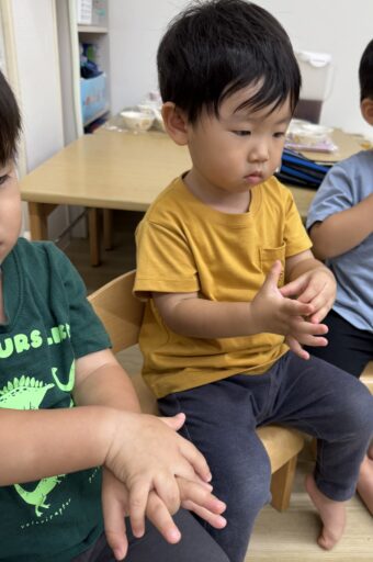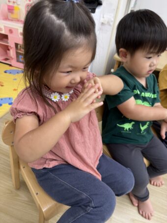 ということでにじ組さんでは、手洗いの紙芝居を見て、手の洗い方について、じっくりと練習してみました。