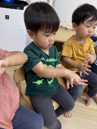 紙芝居を見ながら、同じようにまねっこする子どもたち。【ゆびのあいだ〜】【爪のあいだ〜】【お父さんゆびをくるくる〜】