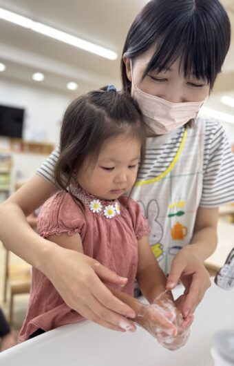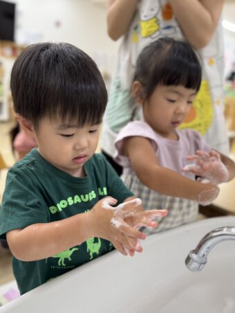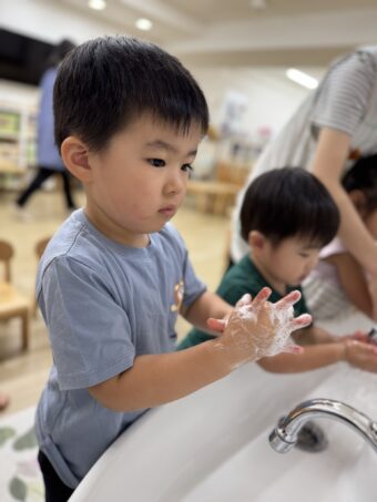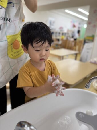 指の間から爪の間。手首などもじっくりとゴシゴシ洗いました。洗い終わったおててを見て、【つめ、きれ〜!!】とお友達同士で見せ合っていました✨