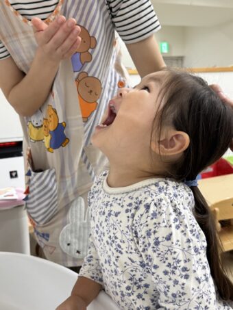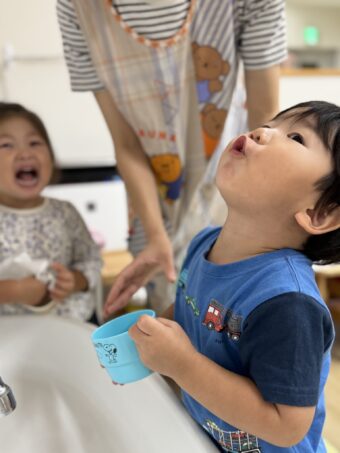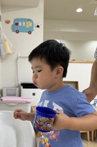 お水はコップの半分まで入れて、前を向いてぶくぶく、上を向いたら【お〜】っと声を出しました