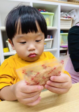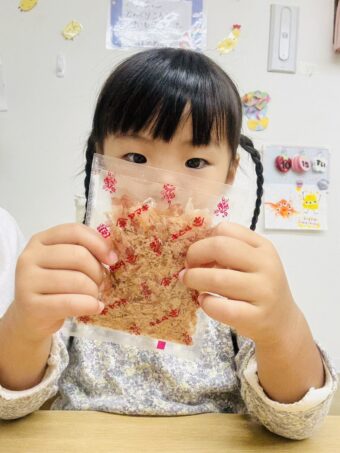 袋越しからですが、かつおぶしを手に取って見てもらいました。
