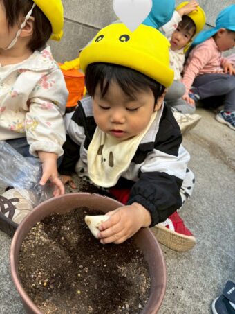 土の感触はお砂場遊びで経験済みなのでへっちゃらです!興味津々な様子が可愛らしいですね❤️