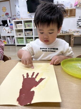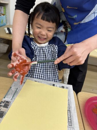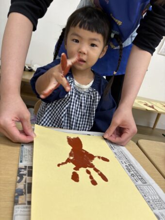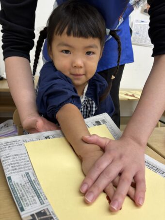 「ぺったん!」いい手形がとれました〜!何になるかな?