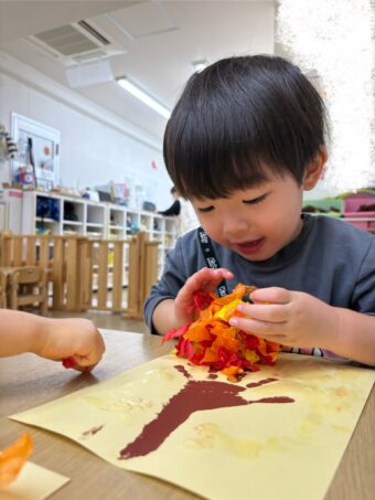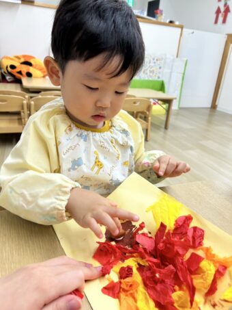 その上にちぎったお花紙を3.2.1.パラパラ〜🍁もうお気づきですか??