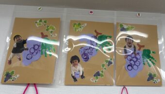 手形スタンプは葉っぱに変身✨✨美味しそうなぶどうが完成しました!Yさんは『ジャーン!』ってしてるみたい!とにじ組さんから好評でした💓Wさんは1粒もぎもぎしたのね〜!食欲の秋もやってきそうです⭐️
