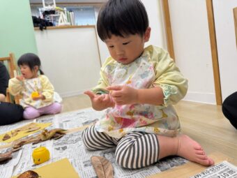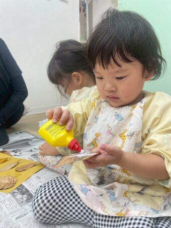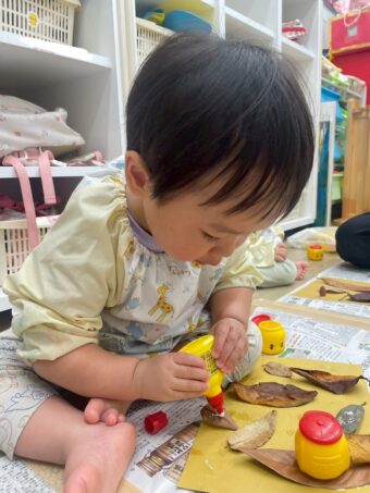 これをつき組さんが公園で大事に拾ってきた葉っぱに塗っていきます!!ヌリヌリ〜チョンチョン!