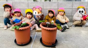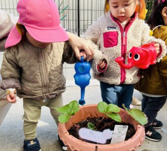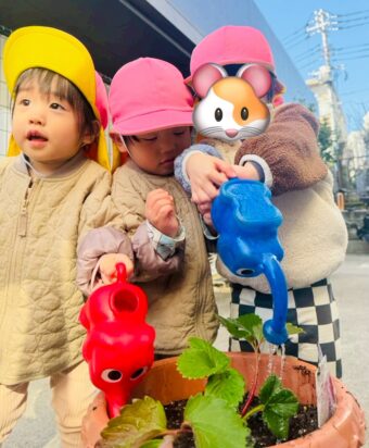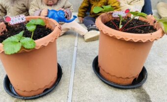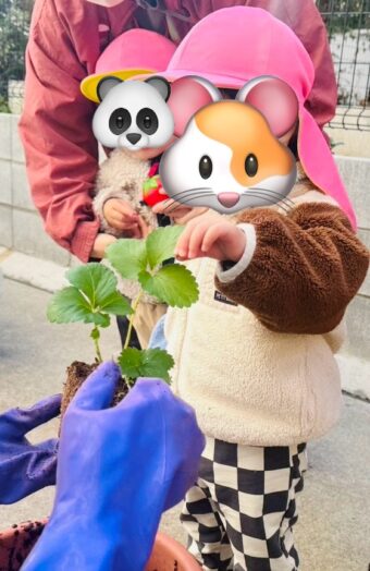秋晴れの青い空の下で、つき組🌙さんのみんなでいちご🍓の苗を植えました。