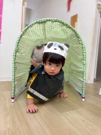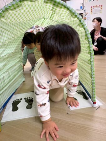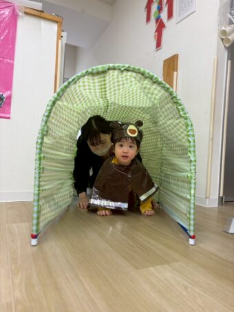 余談ですが、見ていたお友だちも、『変身トンネル』に入ってみたくてウズウズしていたので、もみんなでトンネルをくぐって次の活動へLet’s go!