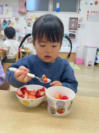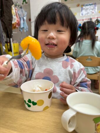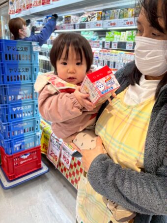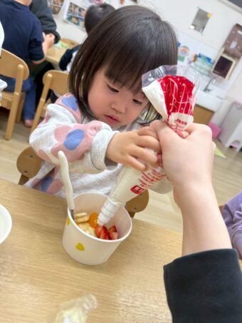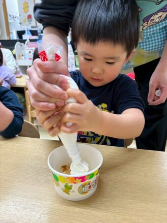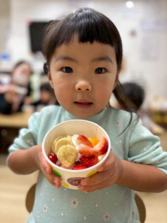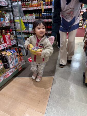 ほし、つき組さんでオオゼキに行ってもらいデコレーションに使うバナナ、いちご、ホイップクリームを購入してもらいました。とても嬉しそうに買い物をしてくれました!