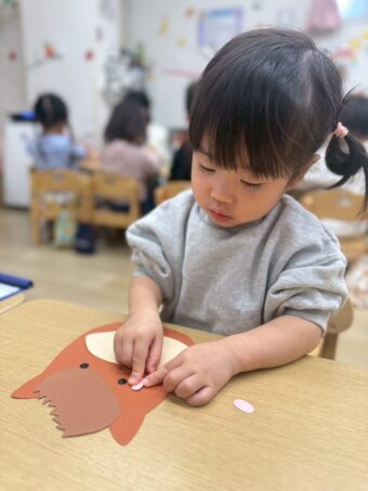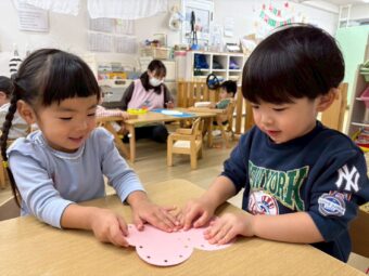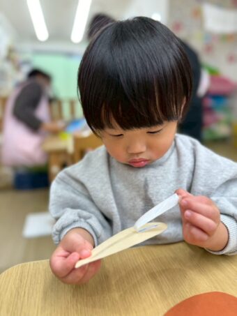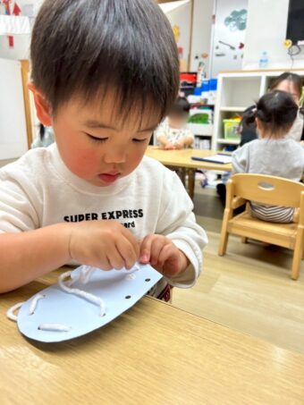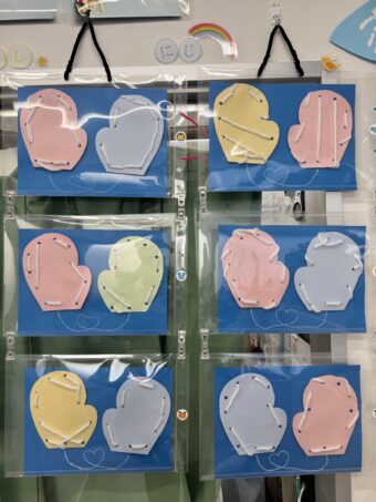 ひも通しに挑戦✊⭐『てぶくろ』ということで、ふわふわの毛糸を通していきました✨対角線やクロスになっていたりと、いろいろな模様が可愛いてぶくろたちですね~☺好きな色を選んで左右異色なのが更に素敵~☺☺お友達のてぶくろとピッタリくっつくと…『ちょうちょになった~』と見立てて遊ぶ子も!!子どもの発想は無限大ですね☺
