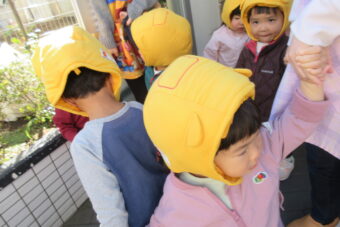 今日は避難訓練(地震)を行いました。 「地震です!!」の声掛けで頭を守るように促すと、手を頭の上に当て、頭を押さえることができました✨ 防災頭巾を被って避難します。