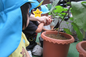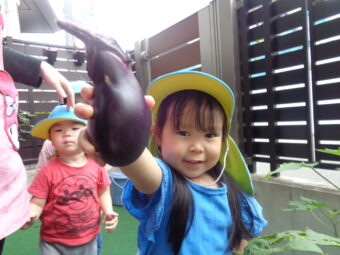 みんなとっても嬉しそうにしていましたよ。収穫したナスは調理さんにお願いをして美味しいお料理に変身しました!