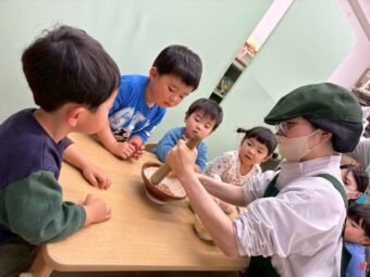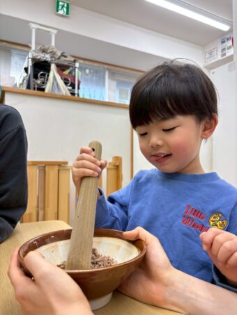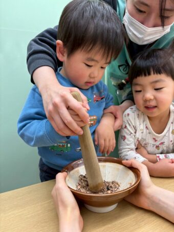 これらをすり鉢にいれてすりこぎですってもらいました!少し難しい様子にも感じられましたがとても一生懸命にやってくれました(#^.^#)