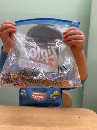 こどもたちには、ジップロックに好きな具材を入れてもらい混ぜたり、つぶしたりしてオリジナルの