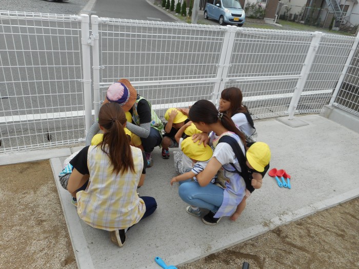 避難訓練をしました。 保育者の「地震だー!!」の声に素早く反応した子ども達!! 急いで保育者の元に駆け寄り、頭を守りました。