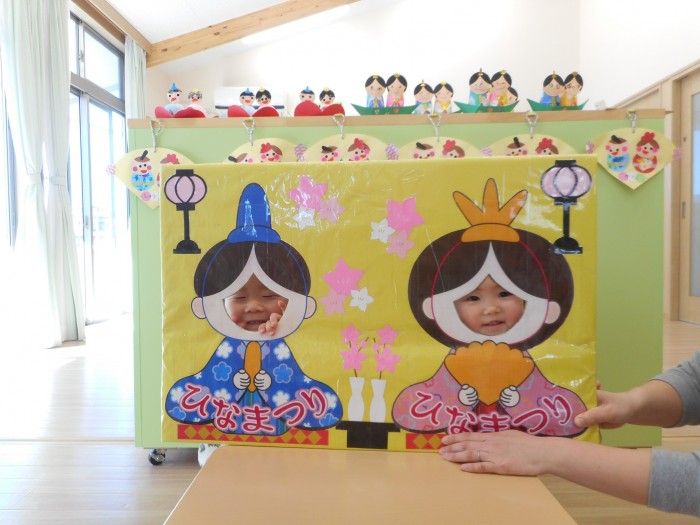 ひな壇ボードを見ながら、ひな祭りについての お話を聞きました👂