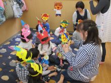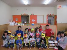 怖い気持ちを我慢してオニに豆を投げる子、泣き出してしまう子と様々でしたが、最後にはオニさんとみんなで写真を撮りました♫